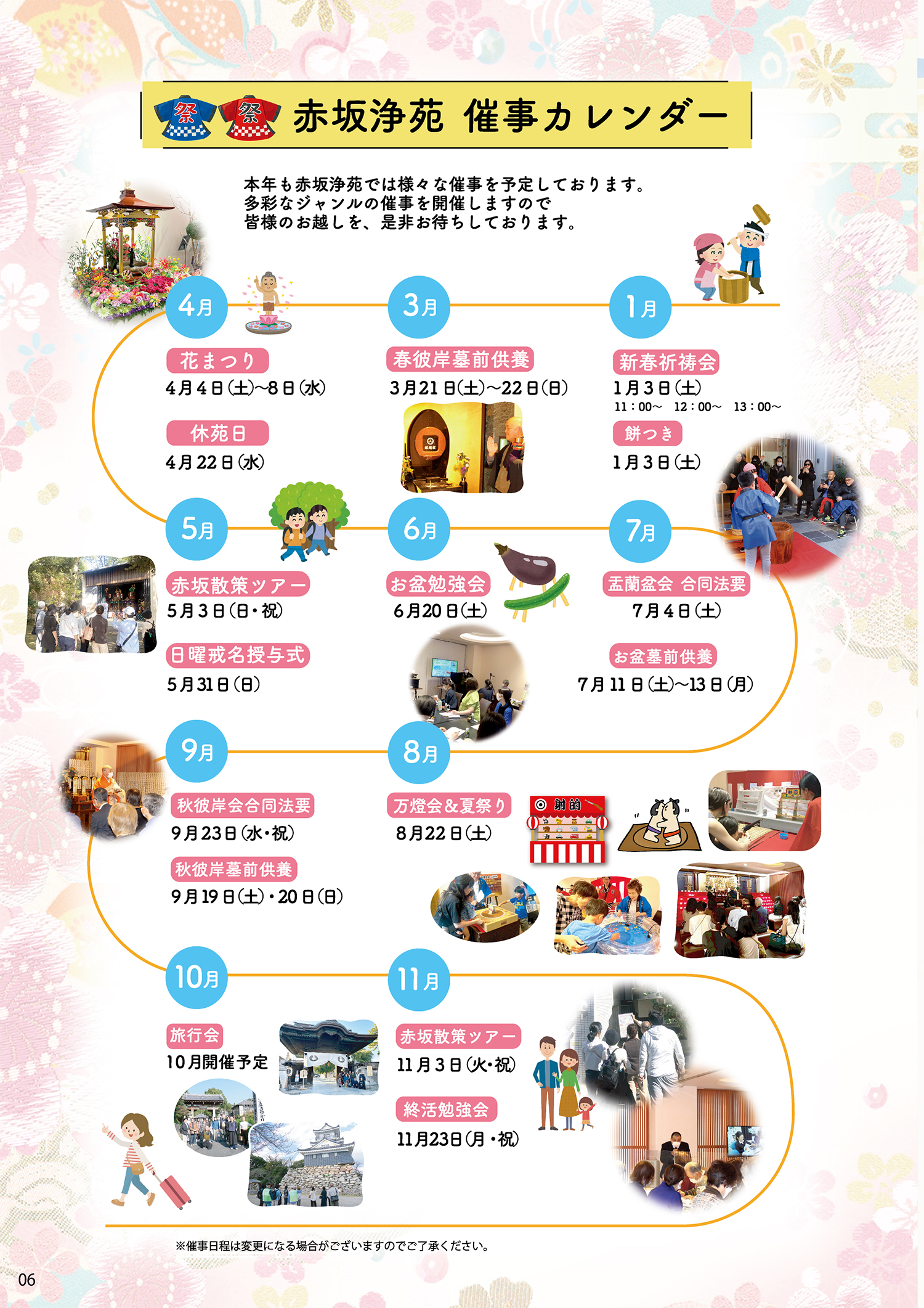 【2026年版】赤坂浄苑 催事カレンダー 2026.01.05 【1月】 新春祈祷会 1月3日(土) 11:00〜/12:00〜/13:00〜 餅つき 1月3日(土) 【3月】 春彼岸墓前供養 3月21日(土)〜22日(日) 【4月】 花まつり 4月4日(土)〜8日(水) 休苑日 4月22日(水) 【5月】 赤坂散策ツアー 5月3日(日・祝) 日曜戒名授与式 5月31日(日) 【6月】 お盆勉強会 6月20日(土) 【7月】 盂蘭盆会 合同法要 7月4日(土) お盆墓前供養 7月11日(土)〜13日(月) 【8月】 万燈会&夏祭り 8月22日(土) 【9月】 秋彼岸会 合同法要 9月23日(水・祝) 秋彼岸墓前供養 9月19日(土)・20日(日) 【10月】 旅行会 10月開催予定 【11月】 赤坂散策ツアー 11月3日(火・祝) 終活勉強会 11月23日(月・祝) 前の記事 【イベントのご報告】2025年11月23日 終活勉強会 次の記事 新年あけましておめでとうございます。 一覧へ戻る カテゴリー 選択してください 最新情報 行事のご案内・ご報告Good Face(協業者紹介)住職・副住職のご挨拶その他 アーカイブ 選択してください 20262025202420232022202120202019201820172016201520142013